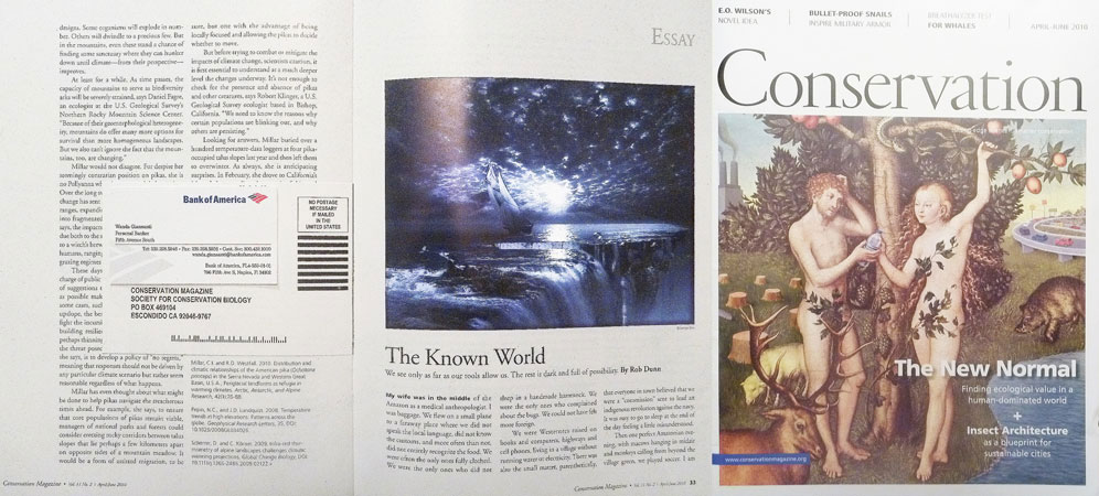UNIVERSITY OF WASHINGTON, Conservation magazine, USA2010 April-June. The "Final Frontier Voyager" work published in, Essay "The Known World" by Rob Dunn. Conservation magazine features cutting edge environmental science and groundbreaking conservation research. From underwater robots that spy on whales to the world's first industrial, indoor farm to the connection between divorce rates and environmental degradation, Conservation stories connect science and data with everyday human experience. |