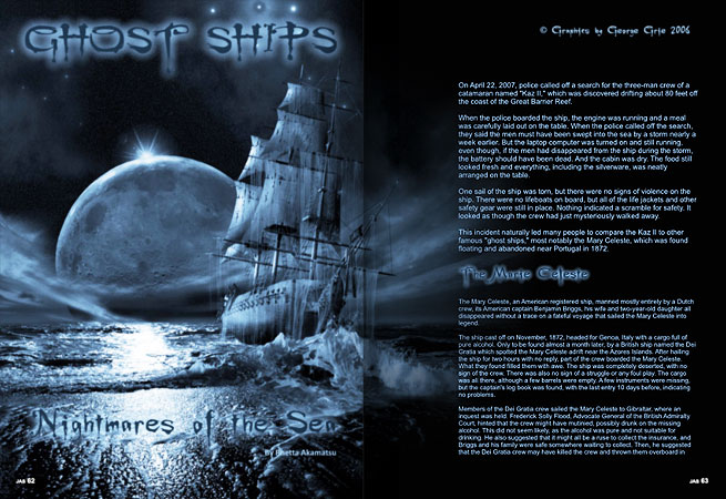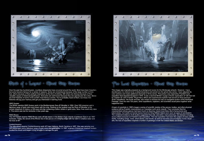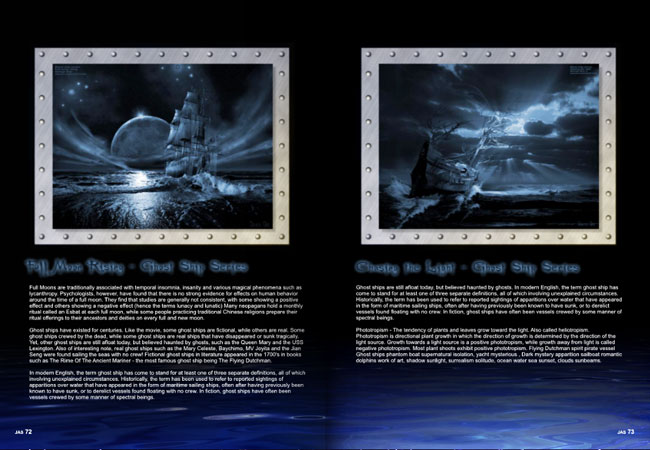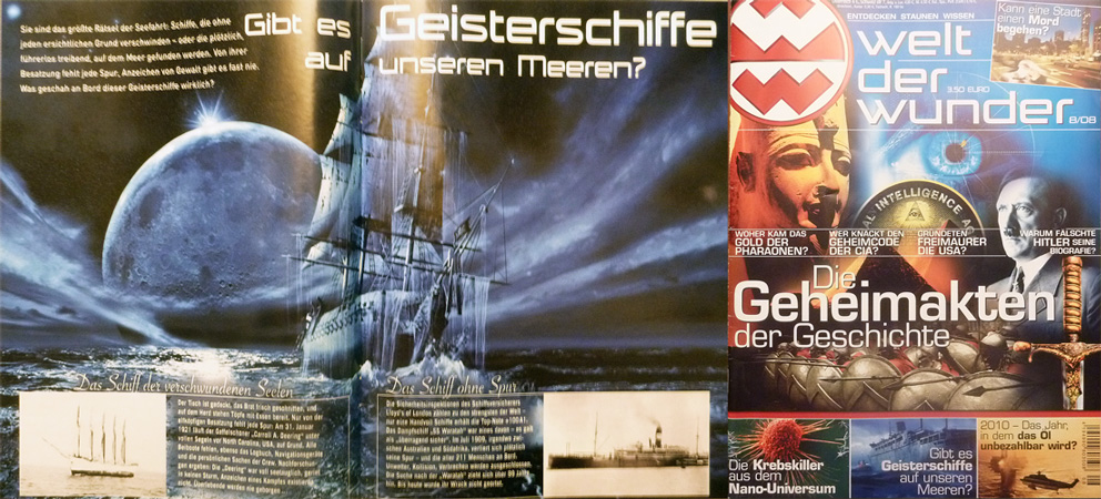 Welt Der Wunder, World of Wonder magazine, Germany2008 August. The "Full moon rising" work published in, Article "Are there ghost ships in our oceans?" World of Wonder is a popular German science magazine, it complex topics are set by a combination of visual representations, graphs and texts in science. The magazine contains articles on various topics such as art, nature, knowledge, history and research. |